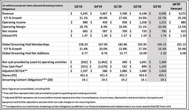 Image Shown: An overview of Netflix Inc’s historical financial and operational performance and a snapshot of its outlook for the fourth quarter of 2020. Image Source: Netflix Inc – Letter to shareholders covering the third quarter of 2020.