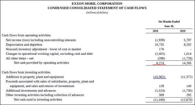 Image Shown: Exxon Mobil generated negative free cash flow during the first half of 2020. Its net operating cash flows are underlined in red and its capital expenditures are underlined in blue. Image Source: Exxon Mobil – 10-Q SEC filing covering the second quarter of 2020