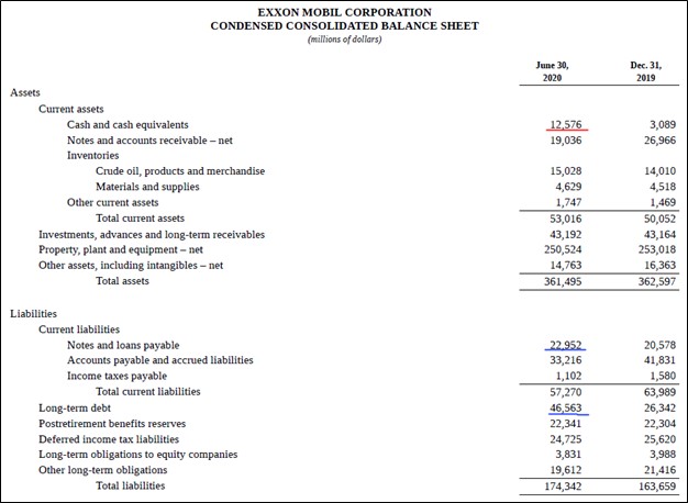 Image Shown: Exxon Mobil carries an enormous net debt position. Its cash and cash equivalents are underlined in red while its short-term and long-term debt loads are underlined in blue. Image Source: Exxon Mobil – 10-Q SEC filing covering the second quarter of 2020