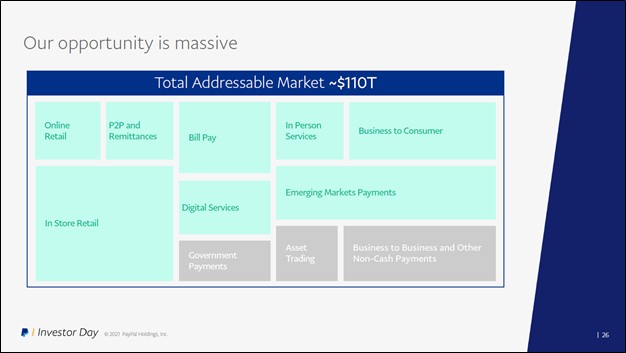 Image Shown: PayPal Holdings Inc views its total addressable market across the payment processing and solutions sitting at approximately $110 trillion, an enormous opportunity that the firm is well-positioned to capitalize on. Image Source: PayPal Holdings Inc – 2021 Investor Day Presentation