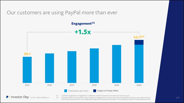 Image Shown: Not only is PayPal’s active user base growing, but each user (on average) has been steadily conducting a greater number of transactions per year across PayPal’s platform over the past five years. Image Source: PayPal – 2021 Investor Day Presentation