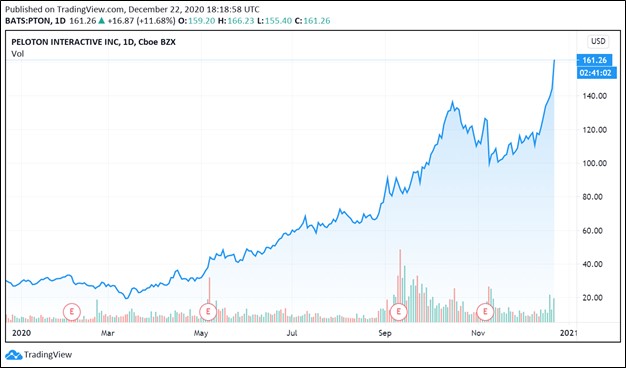 Image Shown: Shares of Peloton Interactive surged higher during 2020. The firm recently announced it would acquire an exercise equipment manufacturer based in the US. As demand for Peloton’s products has been incredibly strong of late, the firm has had trouble keeping up, which in turn has led to delayed deliveries of its “premium” exercise bikes. This acquisition is expected to help alleviate those concerns.