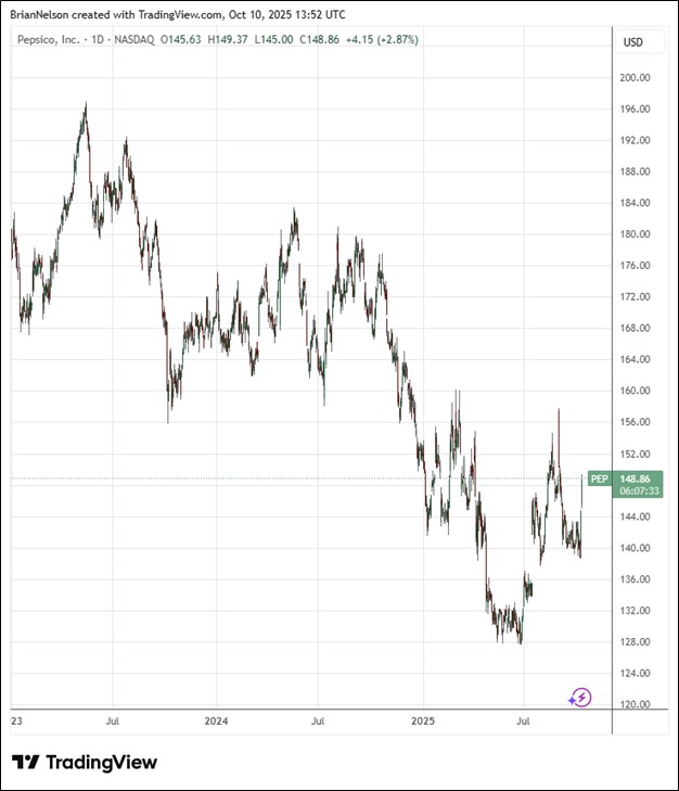 On October 9, PepsiCo (PEP) reported third quarter results that came in better than expected on the top and bottom lines. Net revenue increased 2.6% thanks to a 1.3% increase in organic revenue performance. Earnings per share, however, fell 11%, to $1.90, while core earnings per share of $2.29. Core constant currency earnings per share dropped 2% in the quarter. PepsiCo Goods North America experienced a decline of 3% on an organic basis, while PepsiCo Beverages North America increased 2% organically. Organic revenue in its International Beverages Franchise fell 1%, while organic revenue increased nicely in the EMEA (+5.5%) and Latin America Foods (+4%) divisions. Organic revenue increased 1% in its Asia Pacific Foods segment. Volumes for Convenient Foods and Beverages dropped 1% in the quarter.