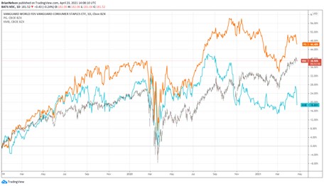 Image Shown: Since the beginning of 2019, on a price-only basis, Procter & Gamble (orange) has handily outpaced the Vanguard Consumer Staples ETF while Kimberly-Clark (turquoise) has stumbled.