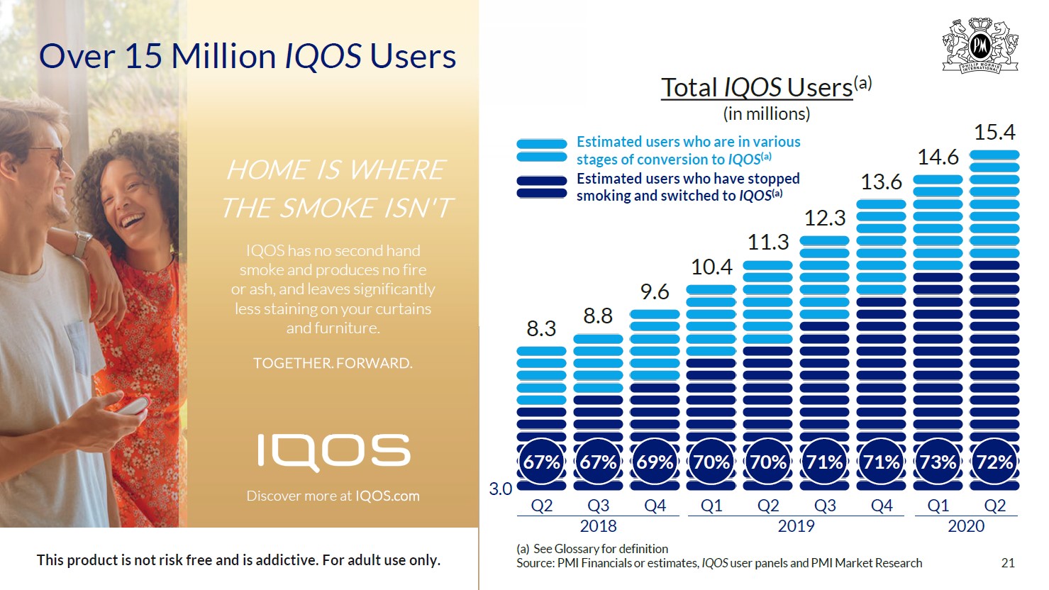 [Philip Morris International] delivered a robust performance in the first half of the year despite the unprecedented circumstances of the pandemic. Most importantly, the continued momentum of IQOS was excellent with an estimated 15.4 million users at the end of the second quarter. Our commercial model pivoted rapidly to digital and remote engagements, while preserving high rates of IQOS’ user acquisition and brand retention. With volumes of heated tobacco units growing 24% in Q2 2020 compared to the prior year, RRPs made up almost one quarter of our net revenues.