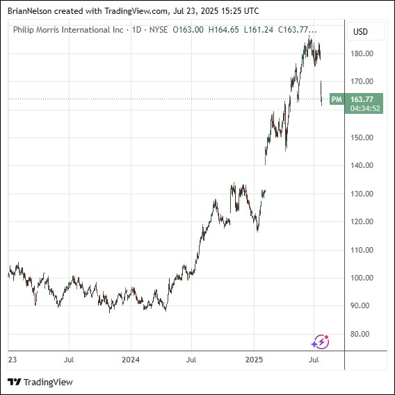 Philip Morris (PM) reported mixed second quarter results July 22, with revenue coming in slightly below expectations, but non-GAAP earnings per share exceeding the consensus forecast. Net revenues increased 7.1% on a reported basis and 6.8% on an organic basis. Its smoke-free business experienced a 15.2% increase in revenue, with 14.5% of that organic. Its combustible portfolio showed a 2.1% increase in revenue, with 2% of that organic. Operating income increased 7.8% on a reported basis in the quarter, while it expanded 14.9% on an organic basis versus the second quarter of 2024. Adjusted diluted earnings per share, excluding currency, increased 18.9% in the quarter.