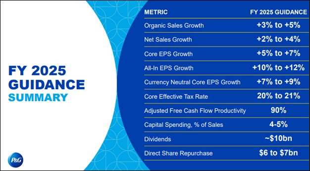 Looking to fiscal 2025 guidance, all-in sales growth is expected in the range of 2%-4% versus the prior year. Organic growth for the fiscal year is targeted in the range of 3%-5%. P&G reiterated its core earnings per share growth for the fiscal year to be in the range of 5%-7%, equating to a range of $6.91-$7.05, or a 6% increase at the midpoint. In fiscal 2025, P&G expects to pay around $10 billion in dividends and repurchase $6-$7 billion of common shares. At the time of this writing, shares of P&G yield ~2.5%.