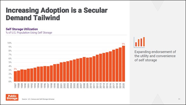 Image Shown: Demand for self-storage offerings in the US has grown at a steady clip since the late-1980s with room for additional upside. Image Source: Public Storage – May 2021 Investor Day Presentation