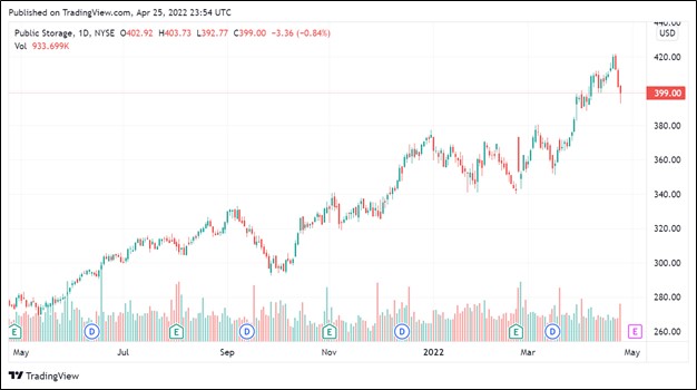 After the market close on May 3, the self-storage real estate investment trust (‘REIT’) Public Storage (PSA) intends to report its first-quarter earnings for 2022, which will be followed up by an earnings conference call a day later. Shares of PSA have been a long-time idea in the High Yield Dividend Newsletter portfolio, and we continue to be enormous fans of the name. The high end of our fair value estimate range sits at $445 per share of Public Storage, indicating that shares of PSA have room to keep running higher. As of this writing, shares of PSA yield ~1.9%.