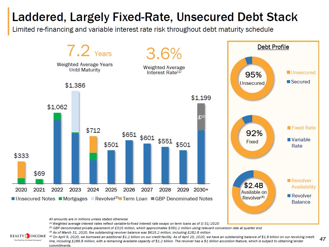 Realty Income noted that as of May 1, the REIT retained $1.1 billion in borrowing capacity under its $3.0 billion revolving credit line (which matures in March 2023) and ~$1.2 billion in cash on hand, according to its latest earnings press release. That, combined with its recent debt issuance, should provide Realty Income with ample liquidity and access to liquidity to ride out the pandemic. In April 2020, Realty Income drew down a large portion of its revolving credit line to bolster its liquidity position as the REIT prepared itself for temporary but material volatility in its financial performance.