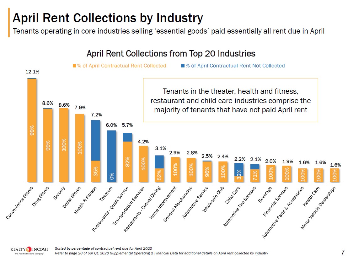 Image Shown: Realty Income collected rent from most of its tenants in April, however, many or all of its theater, health & fitness, restaurants, and child care tenants did not pay rent that month. Image Source: Realty Income – First Quarter of 2020 Earnings IR Presentation