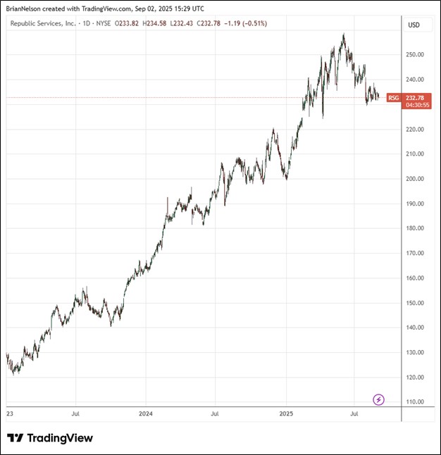Year-to-date, Republic Services’ cash flow from operations was $2.13 billion while year-to-date adjusted free cash flow was $1.42 billion. Year-to-date, Republic has invested $888 million in acquisitions. Year-to-date cash returned to shareholders was $407 million, consisting of $45 million of buybacks and $362 million of dividends paid. For full year 2025, Republic now expects revenue in the range of $16.675-$16.75 billion and adjusted EBITDA in the range of $5.275-$5.325 billion. Adjusted diluted earnings per share is reiterated in the range of $6.82-$6.90 for the year, while adjusted free cash flow is now targeted in the range of $2.375-$2.415 billion. We continue to like Republic Services in the newsletter portfolios.