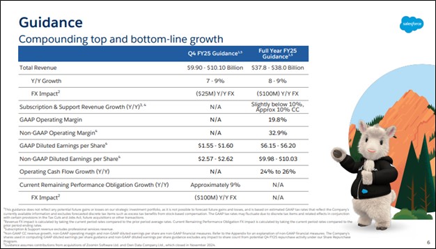 Looking to full year 2025 guidance, Salesforce raised the low end of its revenue expectations to $37.8-$38 billion, up 8%-9% year-over-year, while it maintained its Subscription & Support revenue growth guidance of approximately 10% in constant currency.