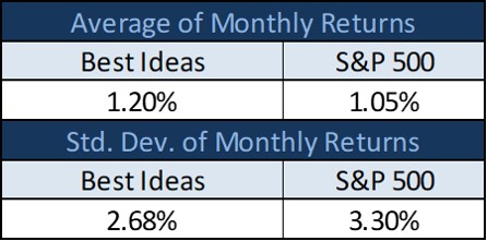 This figure shows the average monthly returns and standard deviation of returns for the simulated Best Ideas Newsletter portfolio relative to its declared benchmark, the S&P 500 (SPY), on an apples-to-apples basis, from inception, May 11, 2017, through December 15, 2017, with dividends collected but not reinvested for both the newsletter portfolio and the SPY. The results are hypothetical and do not represent returns that an investor actually earned. Past results are not indicative of future performance.