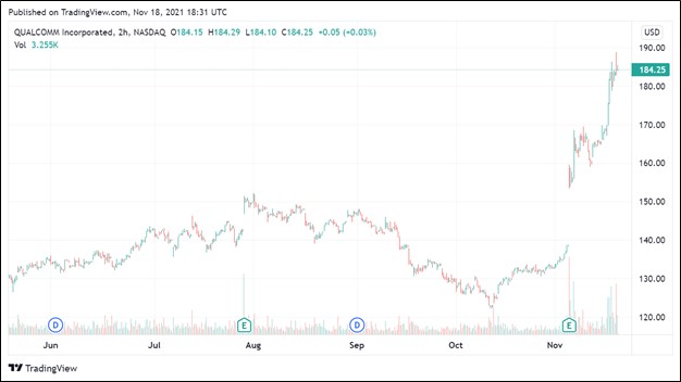 Image Shown: Shares of dividend growth idea Qualcomm Inc have skyrocketed since the start of November in the wake of its latest earnings update and favorable guidance put out during a recent investor day event.