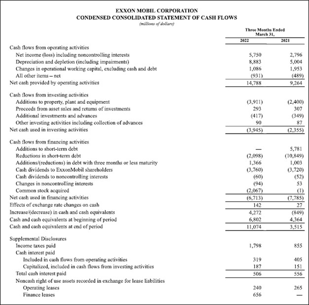 Image Shown: Exxon Mobil is a free cash flow cow in the current raw energy resources pricing environment, aided by its contained capital expenditure expectations. Image Source: Exxon Mobil – 10-Q SEC Filing covering the First Quarter of 2022