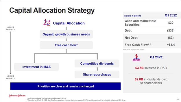 Image Shown: J&J is a solid free cash flow generator with ample liquidity on hand and a relatively low net debt load for a firm of its size. Image Source: J&J – First Quarter of 2022 IR Earnings Presentation