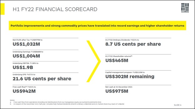 Image Shown: South32’s bottom-line grew materially during the six month period ended December 2021 versus the same period the prior year, aided by huge increases in commodities pricing. Image Source: South32 – First Half of Fiscal 2022 Earnings and Outlook Update