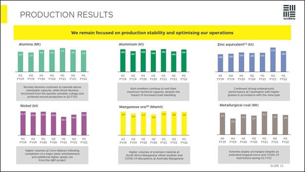 Image Shown: South32’s production base was relatively stable on a net basis during the six month period ended December 2021 versus the same period the prior year. Image Source: South32 – First Half of Fiscal 2022 IR Earnings Presentation