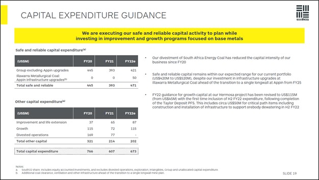 Looking ahead, South32 is guiding for a moderate increase in its capital expenditures in fiscal 2022 versus fiscal 2021 levels and broadly flat versus fiscal 2020 levels. Please note that South32 increased its capital expenditure guidance for fiscal 2022 versus its previous assumptions in conjunction with its latest half year earnings update.