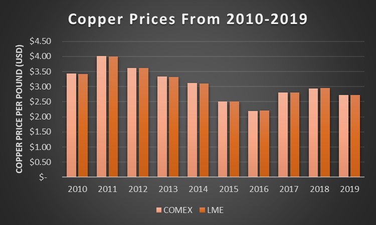 Image Shown: The average copper price per pound in US dollars from 2010-2019 on the COMEX and LME exchanges. Image Source: Valuentum, data sourced from Southern Copper’s 2019 Annual Report