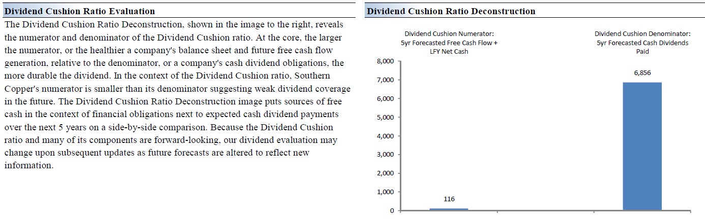 In the upcoming graphic down below, we highlight the numerator and denominator used in our Dividend Cushion ratio calculation, and Southern Copper’s two-page Dividend Report can be viewed here. As we noted in the report, “Southern Copper’s dividends per share have started to stabilize but we caution that historically, the miner’s payout has adjusted to changes in commodity prices and capital expenditure expectations” indicating that based on the firm’s historical dividend policy, management is open to adjusting Southern Copper’s payout program as needed.