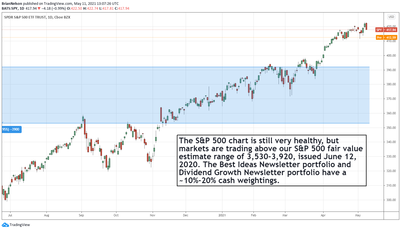 The S&P 500 (SPY), chart shown above, is trading above our fair value estimate range. The recent sell-off should not be surprising, and it has been predominant in speculative free-cash-flow burning technology stocks, of which we tend to avoid. In January of this year, we “raised” 10%-20% cash in the Best Ideas Newsletter portfolio and Dividend Growth Newsletter portfolio, “ALERT: Raising Cash in the Newsletter Portfolios” on account of expectations of a pullback to put some new money “to work,” where applicable. We’re not making any moves quite yet.