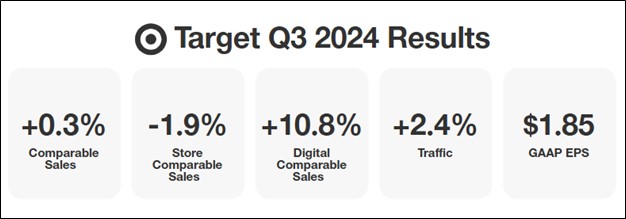 Target (TGT) recently reported third quarter 2024 results that missed on both the top and bottom lines, and the retailer issued ho-hum guidance for the holiday fourth quarter. Third quarter comparable sales advanced 0.3% in the third quarter (versus consensus expectations of 1.5%) as strong traffic and digital performance were offset by a comparable store sales decline of 1.9%. Guest traffic grew 2.4% in the quarter, however, while digital comparable sales increased 10.8% thanks to growth in same-day delivery and drive up.