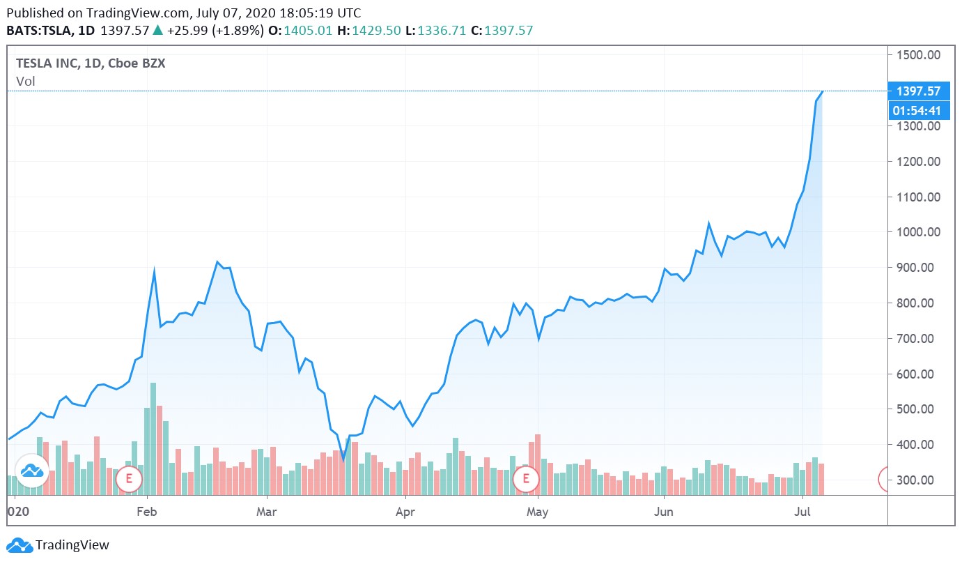 On July 2, Tesla Inc (TSLA) provided an update on the number of electric vehicles it produced and delivered during the second quarter of 2020, when its domestic manufacturing capabilities were hit the hardest by the ongoing coronavirus (‘COVID-19’) pandemic. This report likely acted as the catalyst for the latest run up in shares of TSLA as its technicals have “gone parabolic” of late.
