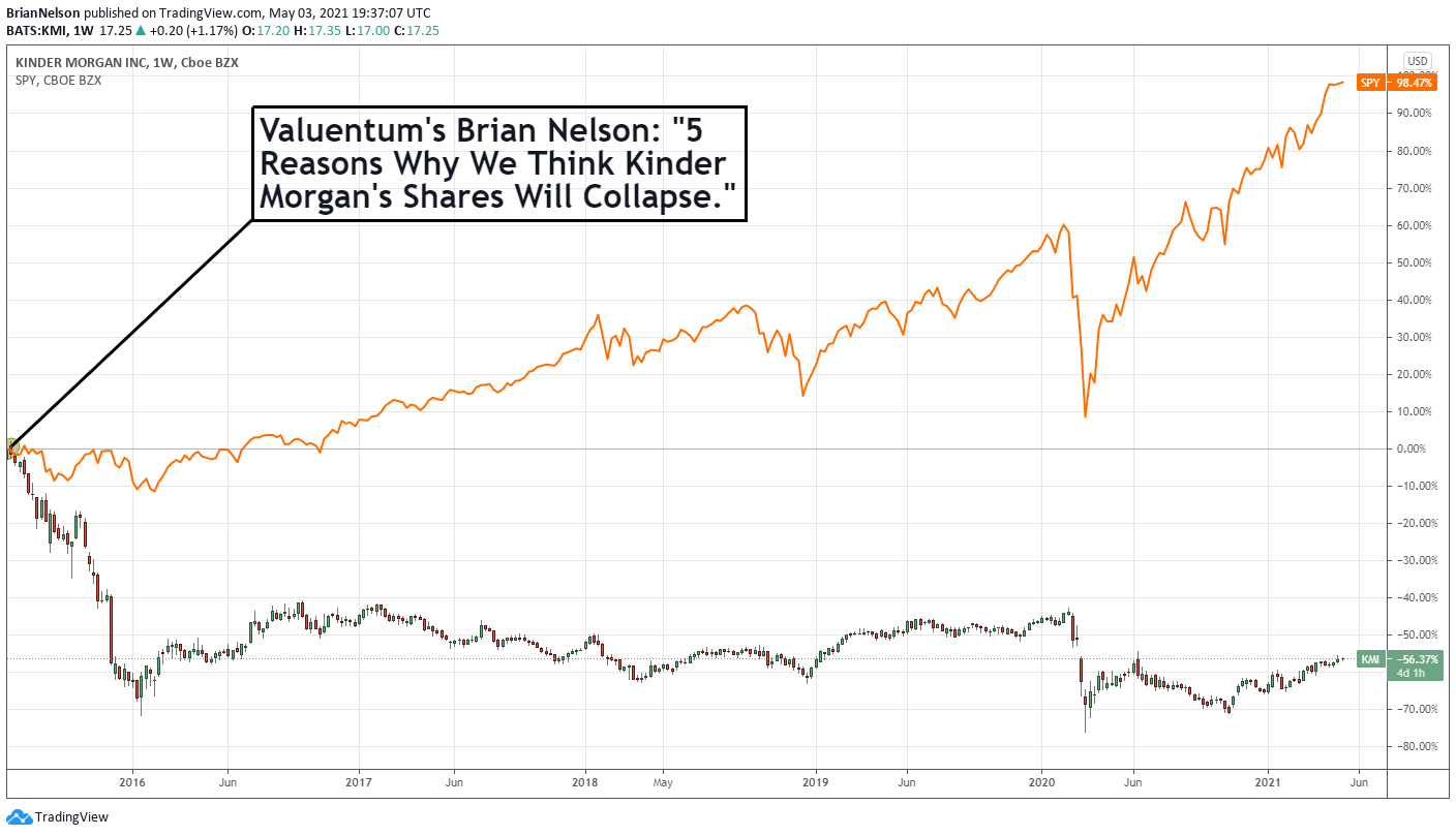 Image Shown: Since mid-June 2015, on a price-only basis, the S&P 500 (SPY) has nearly doubled, while shares of Kinder Morgan have nearly halved.