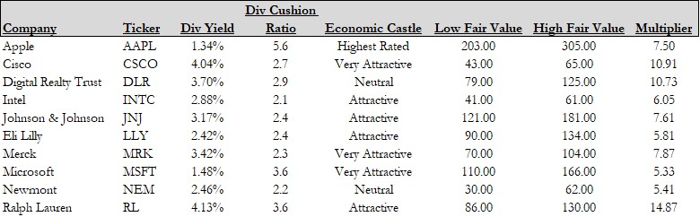 Image Shown: A look at some of the top dividend growth stocks to consider, companies with strong Dividend Cushion ratios and nice payout growth trajectories, in light of ongoing turbulence in equity markets. The ‘Multiplier’ column multiplies a company’s dividend yield by its Dividend Cushion ratio.