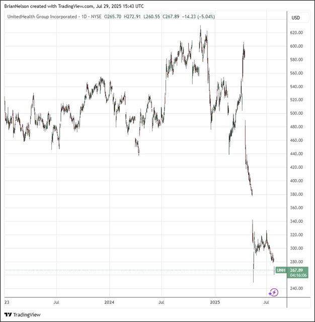 UnitedHealth Group (UNH) reported disappointing second quarter results and issued an outlook for 2025 that came in below expectations. The firm’s second-quarter 2025 revenue grew $12.8 billion year-over-year to $111.6 billion thanks to growth at both UnitedHealthcare and Optum. Second-quarter earnings from operations, however, came in at $5.2 billion, down from $7.9 billion in the same period a year ago. Net earnings were $4.08 per share, below the consensus estimate of $4.45 per share. UnitedHealth Group’s second quarter consolidated medical care ratio of 89.4% was up 430 basis points year-over-year.