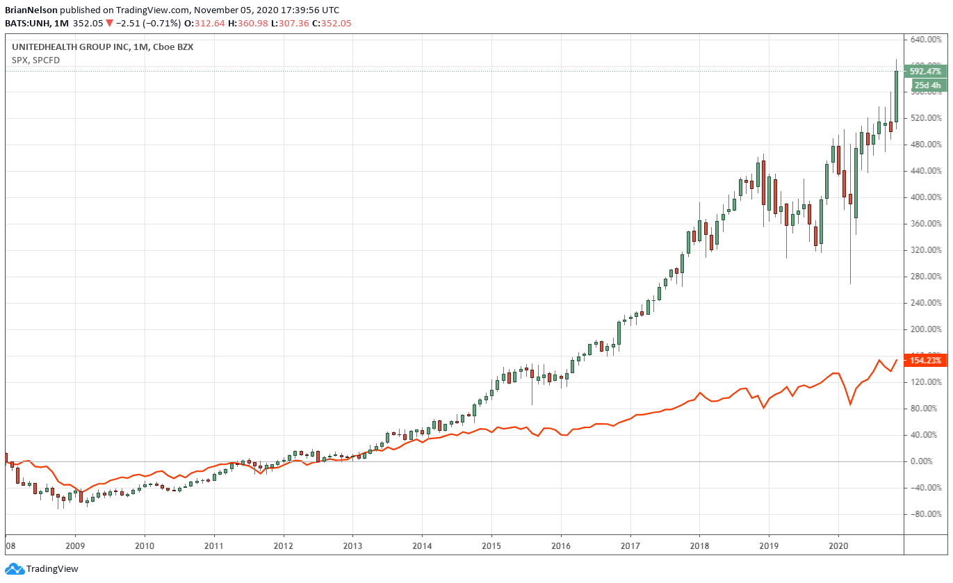 Image: On a price-only basis, from the beginning of 2008, UnitedHealth’s shares have advanced ~600%, while the S&P 500 has increased ~150%. The measurement period covers both the Obama and Trump administrations.