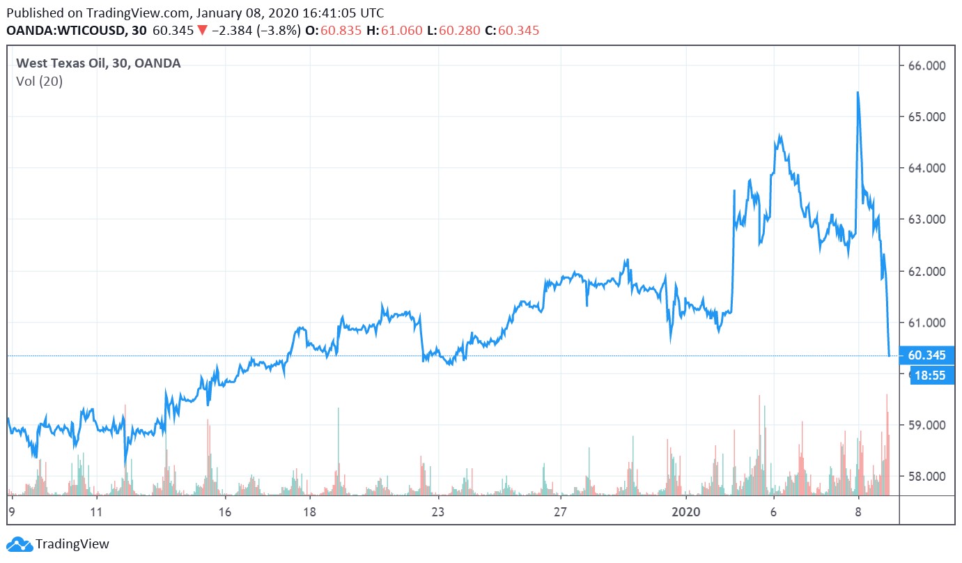Image Shown: Oil sold off aggressively as it appeared the US would pursue de-escalation efforts, after spiking earlier due to recent events.