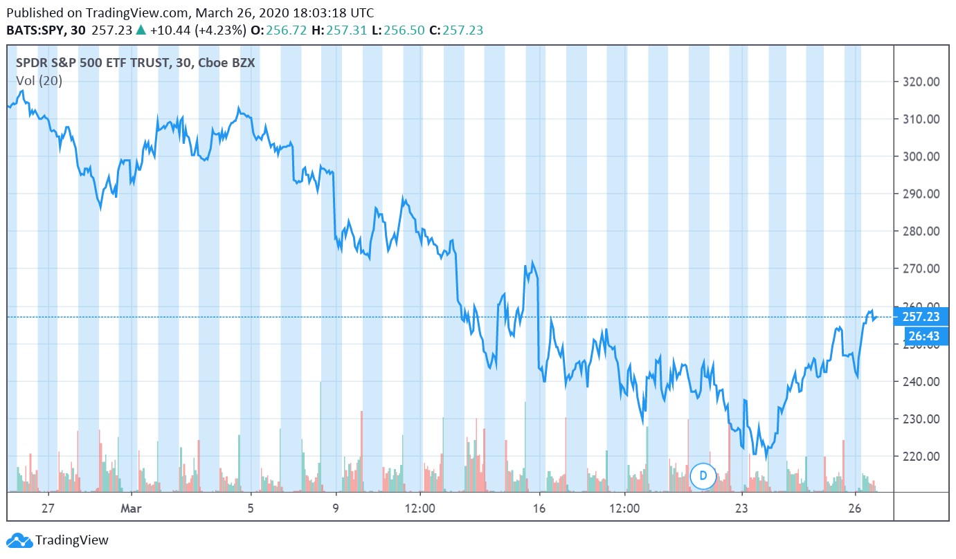 Image Shown: US equities have started to recover some of their lost ground as the likelihood that the US Congress will pass a massive ~$2.2 trillion fiscal stimulus and emergency spending package, dubbed the CARES Act, has increased significantly over the past week as seen through the bounce in the SPDR S&P 500 ETF Trust (SPY). President Trump has clearly indicated that he intends to sign such a bill into law as soon as possible, with the US House of Representatives expected to take up the legislation this upcoming Friday morning on March 27.