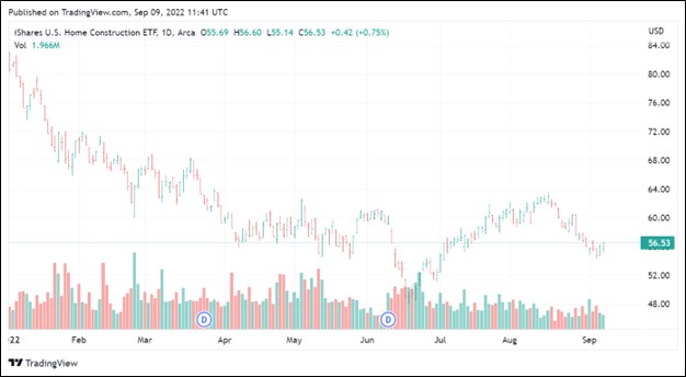 Image Shown: The US housing market is starting to show signs of weakness. Companies involved in the home building business in the US are starting to feel the heat, with the iShares US Home Construction ETF down ~30% year-to-date as of early September 2022 on a price-only basis.