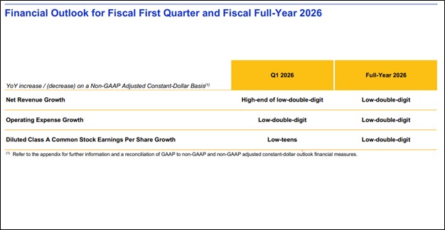 For the 12 months ended September 30, Visa hauled in $23.1 billion in cash flow from operations and spent $1.5 billion in property, equipment, and technology, resulting in free cash flow of $21.6 billion, or 53.9% of total revenue. Visa ended the year with cash and cash equivalents and investment securities of $19 billion and total debt of $25.2 billion. The company returned $6.1 billion in share buybacks and dividends in the quarter, and the board of directors increased its quarterly cash dividend 14%, to $0.67 per share. For full year fiscal 2026, management expects low-double-digit growth in net revenue, operating expense, and diluted earnings per share. We continue to like Visa as an idea in the Best Ideas Newsletter portfolio.