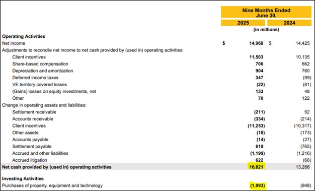 Visa’s fiscal third quarter results showed that the consumer continues to be resilient, with healthy spending trends continuing into July. During the quarter, payments volume increased 8%, while total cross-border volume increased 12%. Processed transactions increased 10% in the quarter. Cash and investment securities were $20.4 billion at the end of the quarter versus $25.1 billion in short- and long-term debt. For the nine months ended June 30, cash flow from operations increased to $16.8 billion, up from $13.3 billion in the same period a year ago. For the nine months ended June 30, free cash flow totaled $15.7 billion, or 53.7% of revenue. We continue to like Visa as a top weighting in the Best Ideas Newsletter portfolio.