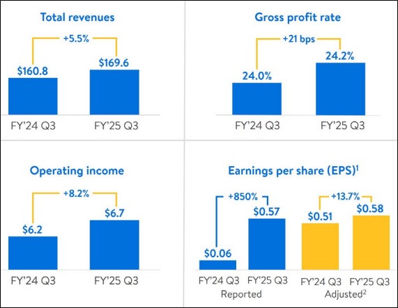 On November 19, Walmart (WMT) reported glowing third quarter results with both revenue and non-GAAP earnings per share coming in better than the consensus forecast and the company raising its guidance. Consolidated revenue grew 5.5% in the quarter, up 6.2% in constant currency, while consolidated operating income advanced 8.2% in the period, up 9.8% in constant currency.
