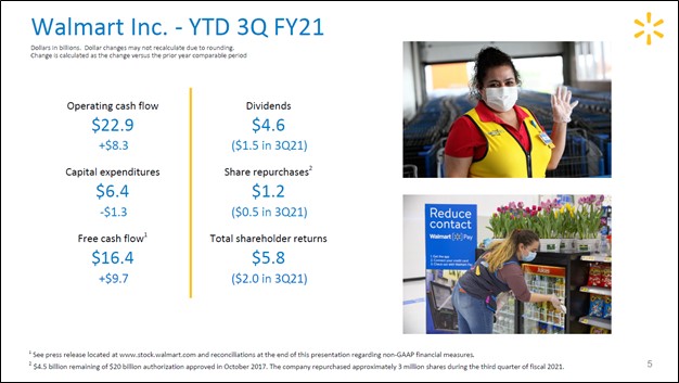 Image Shown: Walmart Inc continues to distribute its free cash flows back to shareholders via dividends and share repurchases. The retailing giant’s management team has a long track record of being shareholders friendly. However, we still view shares of WMT as generously valued as of this writing, given that the top end of our fair value estimate range sits at $133 per share though WMT is currently trading closer to ~$150 per share. Image Source: Walmart Inc – Third Quarter of Fiscal 2021 IR Earnings Presentation