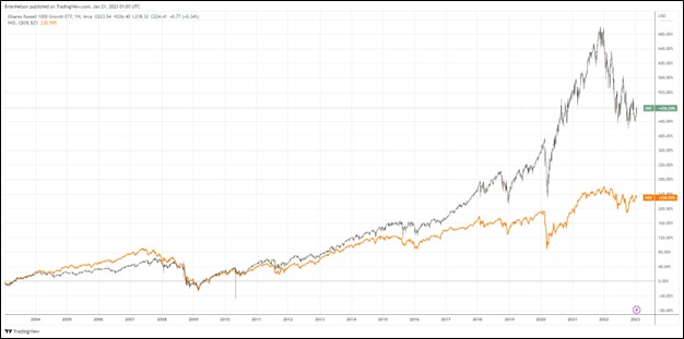 For the sake of entertainment, let’s just assume that one of the largest index providers, Blackrock (BLK), Inc. is doing things right, or at least doing things in some ways how the quants might have intended to divvy up “value” and “growth” stocks. The iShares Russell 1000 Value ETF (IWD) has a price-to-book ratio of 2.21, as of January 19, 2023, while the iShares Russell 1000 Growth ETF (IWF) has a price-to-book ratio of 8.82 at the same time. It seems the quants might agree that these ETFs are decent representations of what might have been intended for the layman to capture a so-called statistical “value premium.” After all, the IWD (“value”) has low price-to-book stocks, while the IWF (“growth”) has much higher price-to-book stocks. So how has the IWF (“growth”) performed relative to the IWD (“value”) the past 20 years?